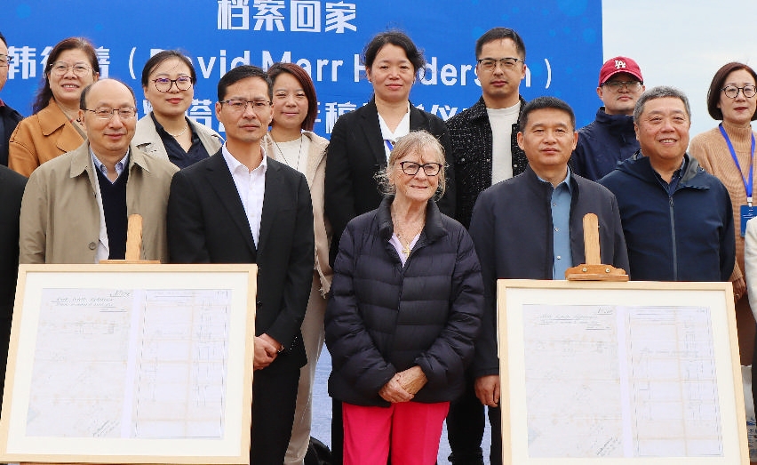 伊芙女士(前排中)和景祥祜教授(前排右一)、程继红教授(前排左一)等人在设计手稿复件前合影