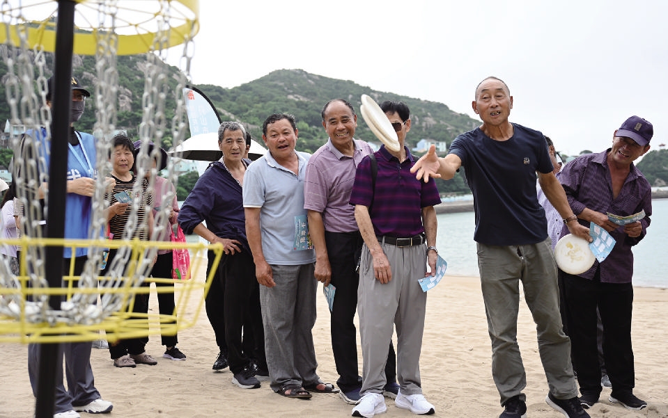 “YUE动千岛”全民健身公共服务流动驿站——“体育大篷车”开进普陀区虾峙镇,海岛居民体验健身小游戏