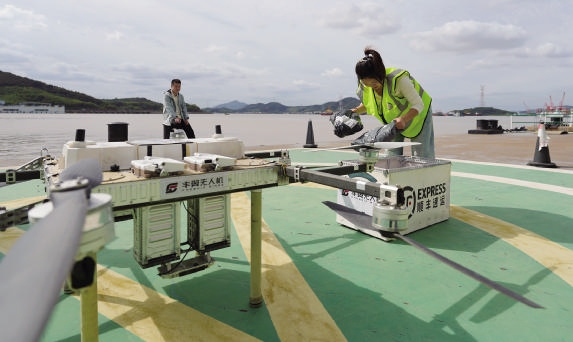 定海南部诸岛客货邮综合运输服务站,工作人员将快递装上无人机并飞往小岛投送
