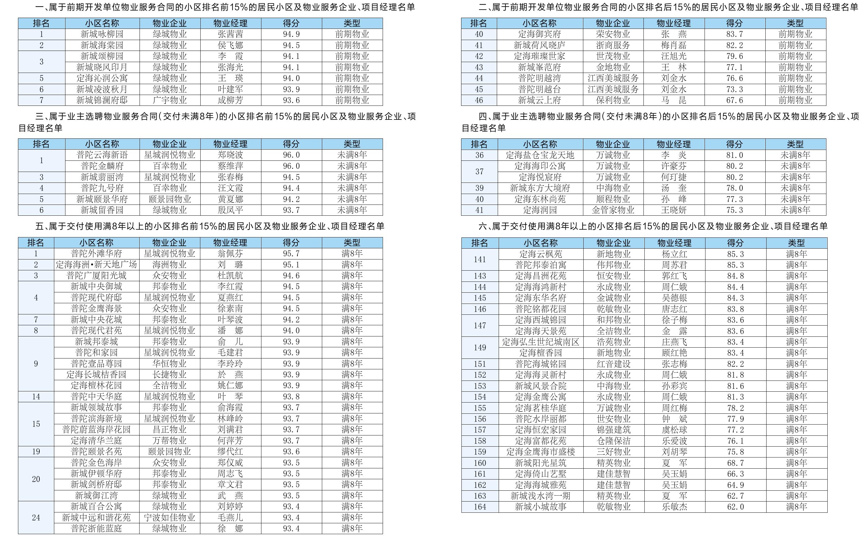 全市中心城区物业服务质量考评结果按三类分类排名,每类排名前15%及后15%的居民小区及物业企业名单公布如下。