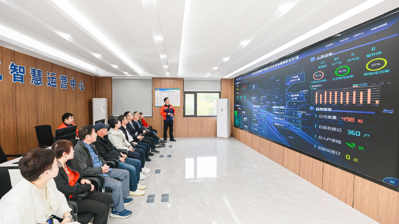 “你们看,这个画面实时显示了各气站的安全数据,包括气瓶充装、配送、回收等环节的详细信息,确保每个环节安全合规。一旦发现安全隐患,系统会立即发出预警。”金国平介绍,该中心能对安全隐患进行统一管理和跟踪,从隐患的发现、上报、整改到复查,每个环节都有明确的责任人和时间节点,确保隐患得到及时有效的处理。