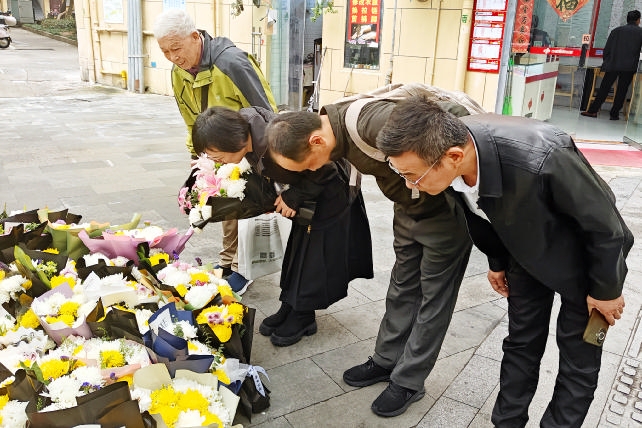 这块见证着两家三代人红色情谊的石碑前,整齐摆放着数十束鲜花,不时有市民静静地驻足缅怀。顾柳松说,他退休后常来此处担任“义务讲解员”,向来往群众讲述朱枫等革命先辈的事迹。