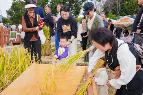普陀田园综合体,小朋友们和家长体验水稻收获过程 图/柯军
