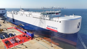 当日,由中集来福士为挪威建造的7000车位LNG双燃料汽车运输船“NOCC PACIFIC”号在山东省龙口市完工并举行命名仪式。该船针对新能源汽车运输安全做出了专门设计,可满足将于2026年1月1日起强制实施的《国际海运危险货物规则》第42-24修正案要求。新华社 发(唐克 摄)