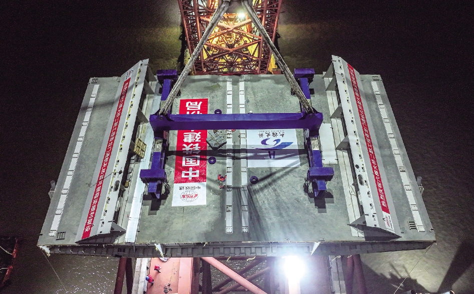 “起钩!”昨天19时40分,随着现场指挥一声令下,1200吨级浮吊的“巨臂”缓缓上扬,将钢箱梁平稳吊起。经过1个半小时平稳移动与精准对位,钢箱梁成功抵达指定桥墩上方。测量人员反复校准钢箱梁平面位置与高程,确保其与桥墩支座贴合度误差控制在毫米级以内。随着最后一组高强螺栓紧固到位,首片钢箱梁架设任务圆满完成。