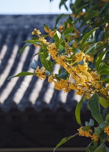 穿过条条曲折的长街,只身入幽深的小巷。在沉寂无声的青石板铺就的小路上,在篆刻着精致木花的窗棂边,藏匿着往日岁月中的童真。以黑瓦整齐排列而成的屋顶敛暮光,流淌着朴实的微芒,渐渐淹没在满树簇簇桂花中。