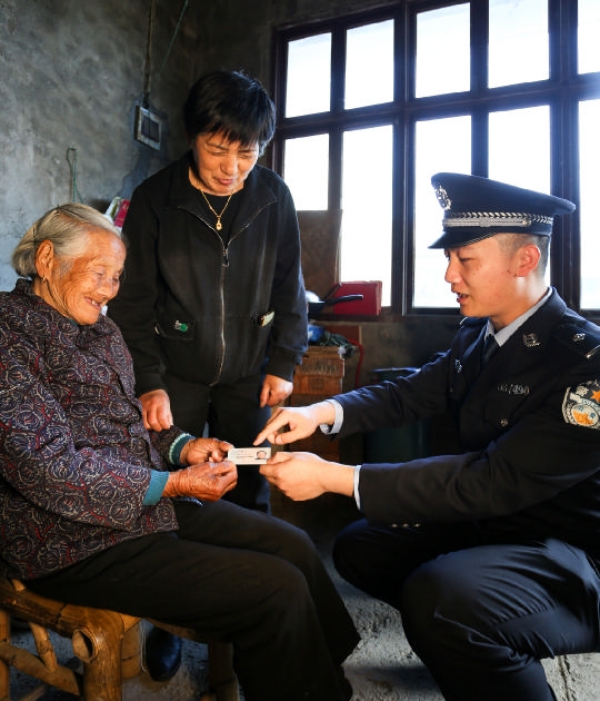 图为民警给辖区行动不便的群众送证上门