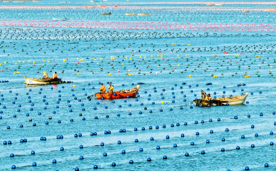 眼下,山东省荣成市海带播苗作业全面展开,养殖工人们抓紧时间进行夹苗、播苗等作业。