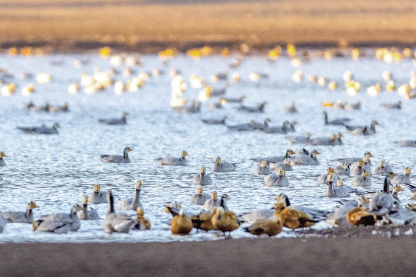冬日时节,拉萨市林周县迎来大批越冬候鸟,黑颈鹤、斑头雁、赤麻鸭等候鸟在河谷、湖泊等地觅食、休憩。 新华社记者 李键 摄
