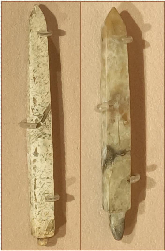 鉴于上述形势,商周时期的徐国合纵连横、潜入长江,面对唾手可得的舟山群岛,自然心向往之。因此我们相信,徐偃王传说置于舟山,是基于这一历史大背景下,徐国向东海大规模开疆拓土、攫取海洋资源的历史演义。吴莱组诗(七)说偃王“终捐玉几砚,不救朱弓矢”的暗语,也与徐国具备高超的治玉和冶铜的精湛技艺高度吻合。又好巧不巧,这种代表当时最高生产力水平的治玉和冶铜产品——玉圭和青铜矢(见图2)深埋地底三四千年,终在马岙唐家墩和白泉苦竹岭重见天日。这仅仅用“巧合”二字显然是搪塞不了的。