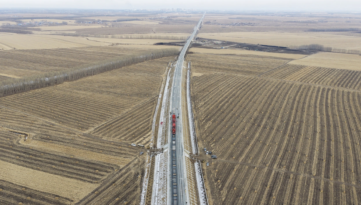 这是11月25日在黑龙江省绥化市庆安县永华村拍摄的哈伊高铁哈铁段铺轨现场(无人机照片)。