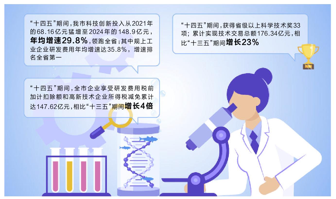 科技创新,离不开资金投入。“十四五”期间,我市科技创新投入从2021年的68.16亿元猛增至2024年的148.9亿元,年均增速29.8%,领跑全省。规上工业企业研发费用也呈爆发式增长,从2020年的35.2亿元激增至2024年的119.82亿元,年均增速达35.8%,增速排名全省第一。