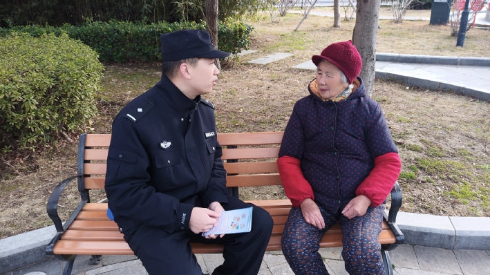 图为孙琪男日常走访群众,为辖区老人讲解反诈宣传内容