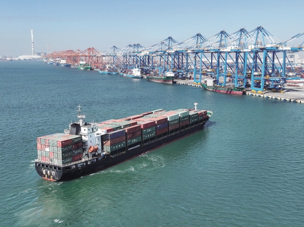 11月29日,一艘海轮驶向钦州港码头(无人机照片)。