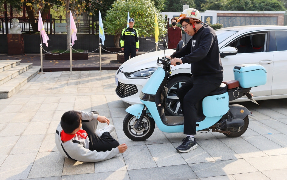 12月2日是第14个全国交通安全日。昨天下午,普陀区六横中心小学教育集团台门校区请普陀交警大队六横中队来校开展交通安全情景演示,包括开门杀、逆向行驶、内轮差、鬼探头等交通事故典型案例,以及遇车辆冲撞如何紧急避险、如何正确佩戴安全头盔等,加强师生交通安全意识。