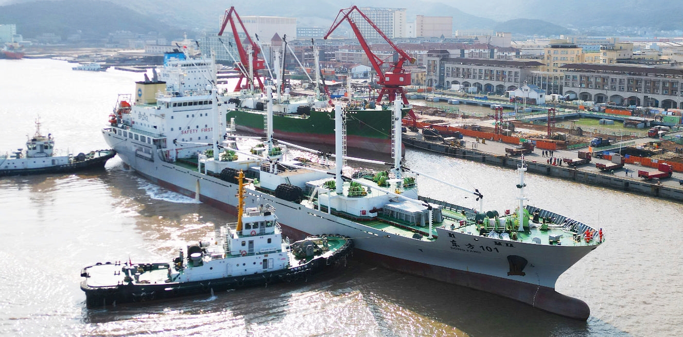 大宗商品资源配置枢纽建设本报讯 昨天9时40分,在拖轮的协助下,从北太平洋返航的冷藏船“东方101”轮装载4600余吨冻鱼,缓缓靠泊舟山国家远洋渔业基地惠群码头(见图)。