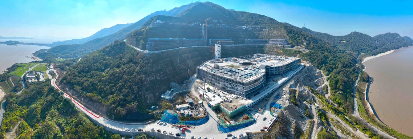 在普陀“最美公路”西侧的“天空之城”项目工地,工人们正在抓紧施工。“天空之城”总投资约22亿元,总规划建筑面积约28万平方米,将打造一个大型多功能海岛文旅度假综合体。截至目前,该项目已完成总工程量的60%,预计明年底前竣工。 摄影 记者 陈永建