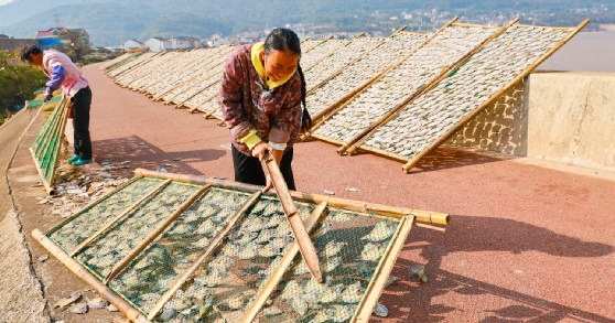 近日,在普陀区东港街道塘头村,一排排鱼鲞晒在海塘边,形成一道独特风景。这里每年都有大量鱼鲞通过电商平台销往全国各地,为当地村民增加经济收入。 摄影 记者 张磊