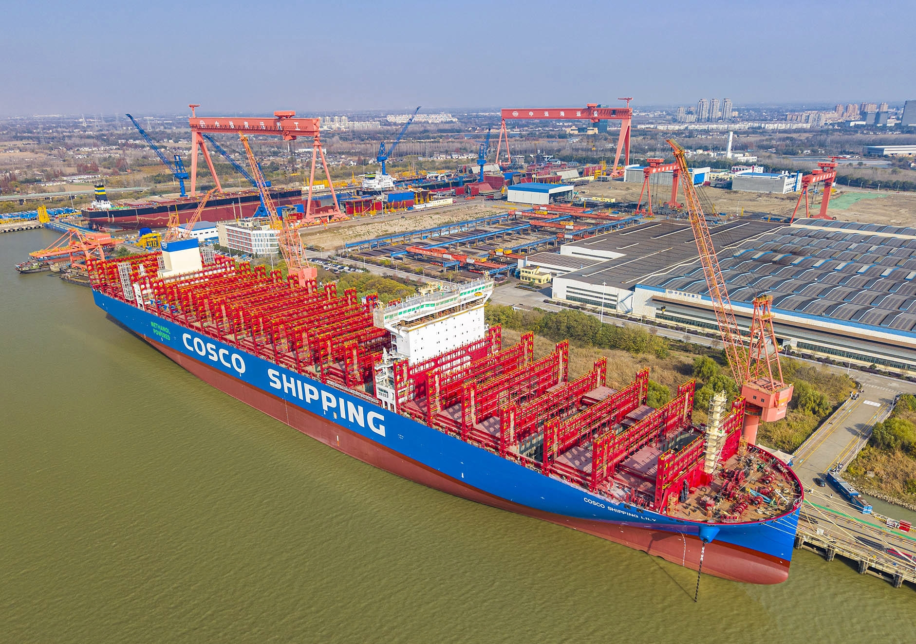 12月10日,在江苏省扬州市江都区扬州中远海运重工有限公司生产厂区,大型船舶正在建造中(无人机照片)。