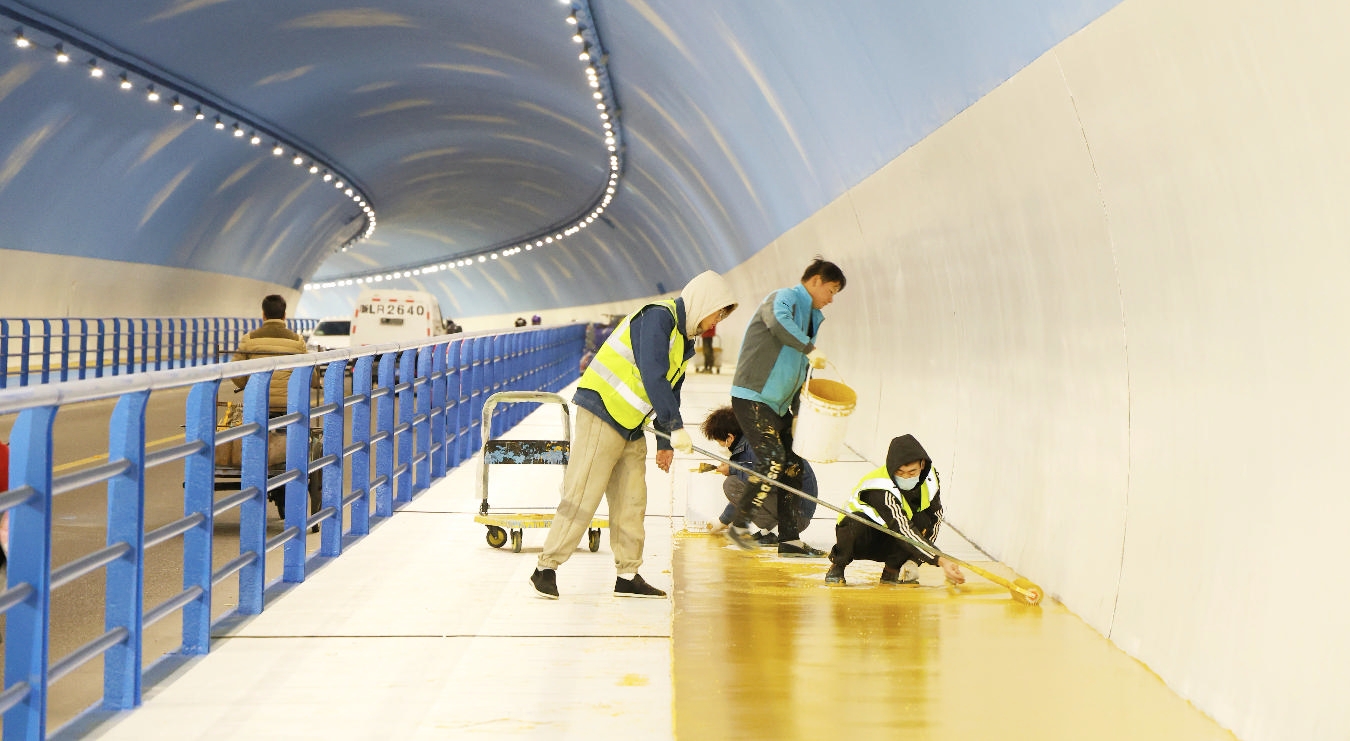近日,定海竹山隧道启动实施涂装亮化工程。施工人员对隧道护栏、侧墙、拱顶、地面等区域进行焕新改造,优化照明景观效果,进一步提升隧道通行安全可靠性和内饰美观度。 摄影 记者 陈永建