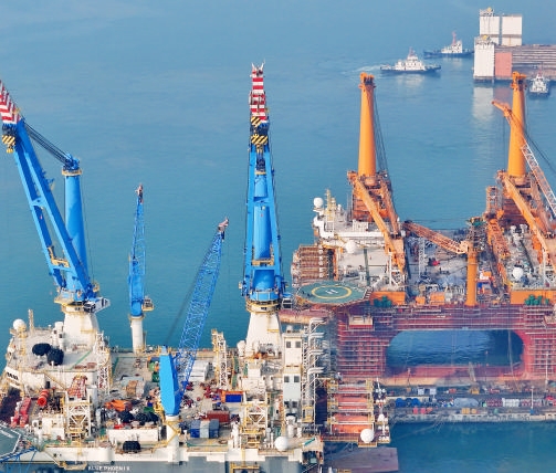 12月16日,在中集来福士山东烟台建造基地,多型海工装备在进行建造作业(无人机照片)。