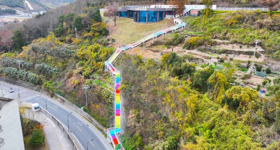 近日,在东海云廊擂鼓山段,刚完成提升改造的彩虹渐变色阶梯引来游客观光打卡 摄影 记者 陈永建