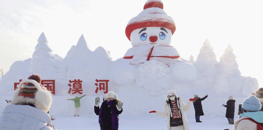 12月23日,游人在漠河站站前广场与“最北大雪人”合影。