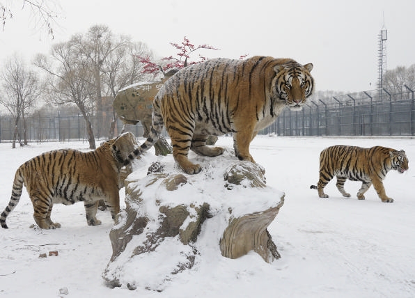 1月12日,冰城哈尔滨市迎来降雪天气,在黑龙江东北虎林园,散放区的东北虎在雪地活动。