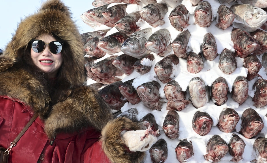 1月10日,在黑龙江省肇东市大似海冬捕渔猎文化节上,游客在“冻鱼塔”前留影。