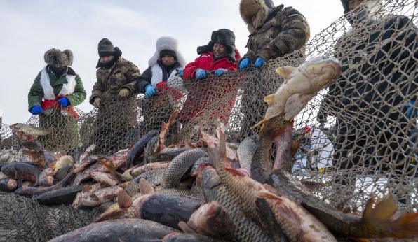 1月17日,2026兴凯湖冬捕节在中俄界湖兴凯湖畔启幕。人们在现场共同见证千米大网破冰而出,万鱼腾跃竞逐的震撼场景,感受传承千年的肃慎渔猎文化,体验北国边境冰雪文化独特魅力。