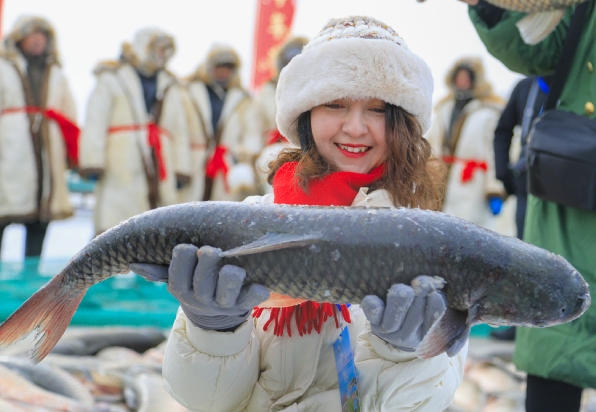 1月18日,在博斯腾湖冰面上,游客手捧刚打捞上来的博斯腾湖鱼。