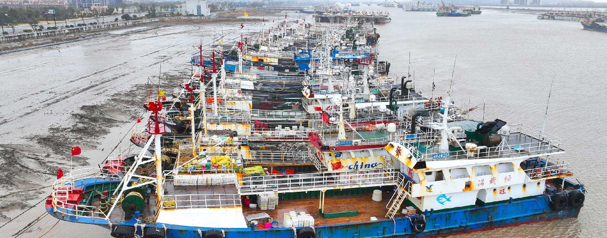 昨起寒潮影响我市。大批渔船陆续回港,停靠至沈家门渔港等地避风御寒。