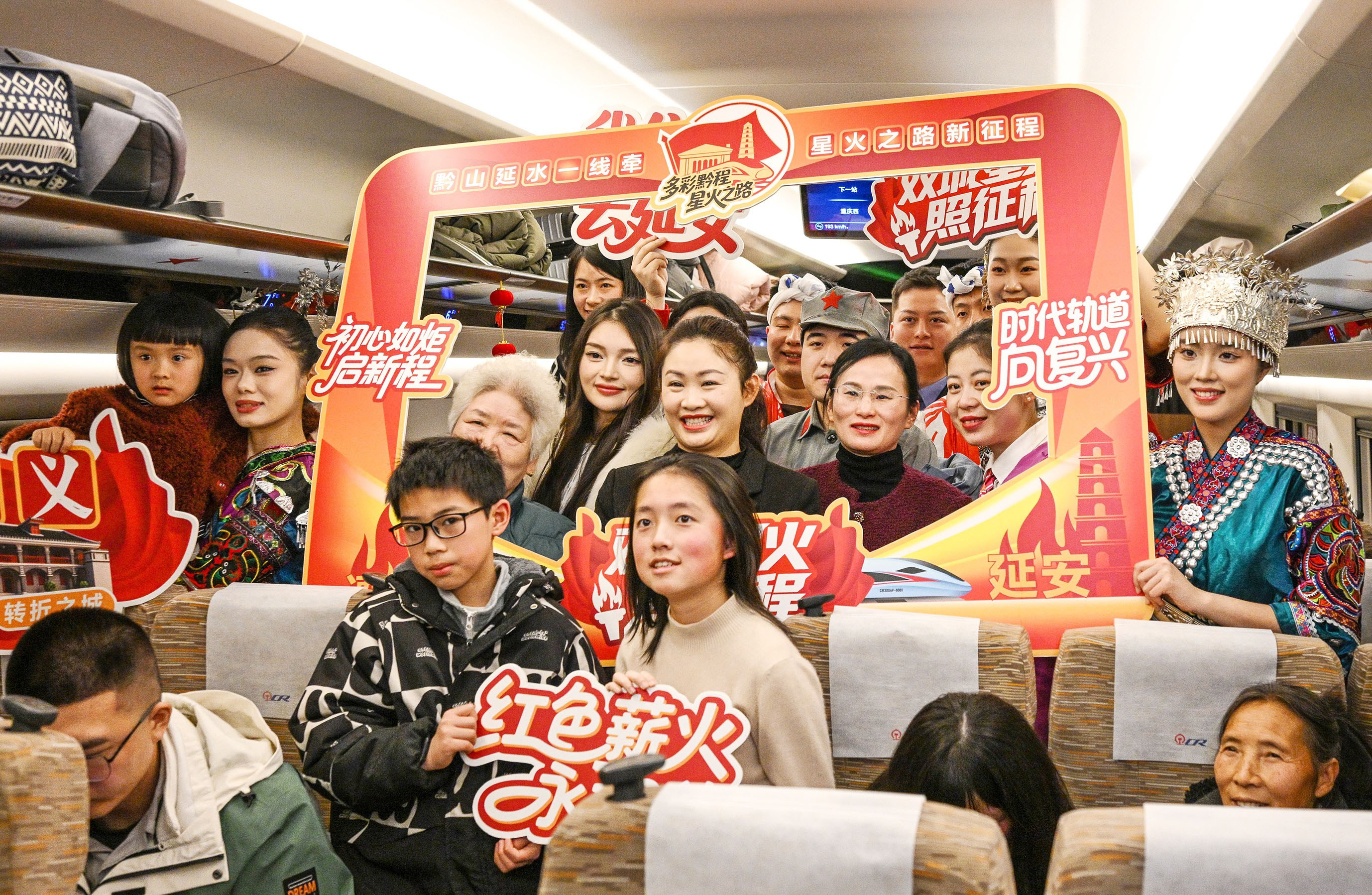 1月26日,旅客与乘务员在遵义开往延安方向的G3360次列车上合影。