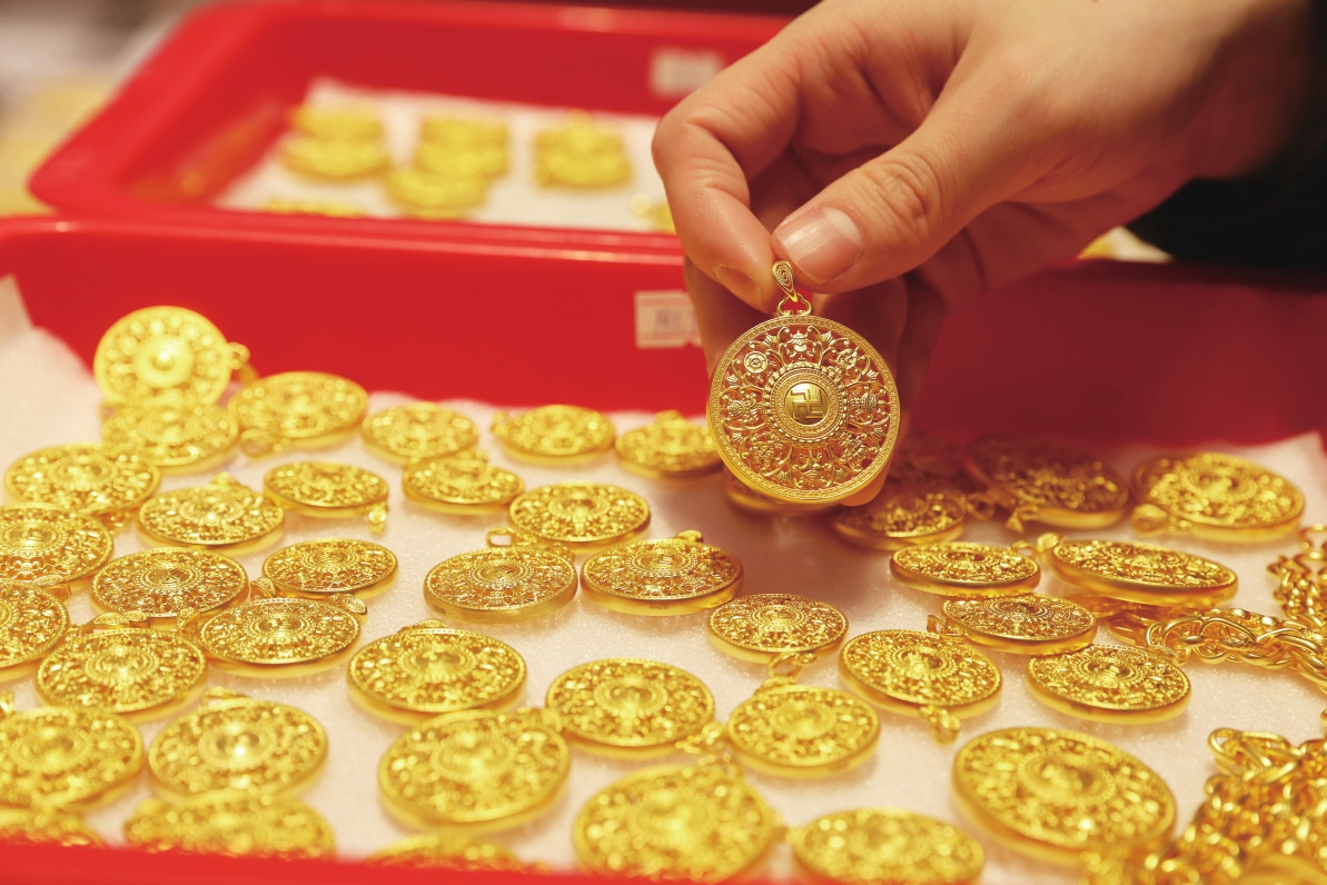 1月28日,员工在位于浙江省杭州市萧山区瓜沥镇的杭州航民百泰首饰有限公司展厅整理黄金首饰。