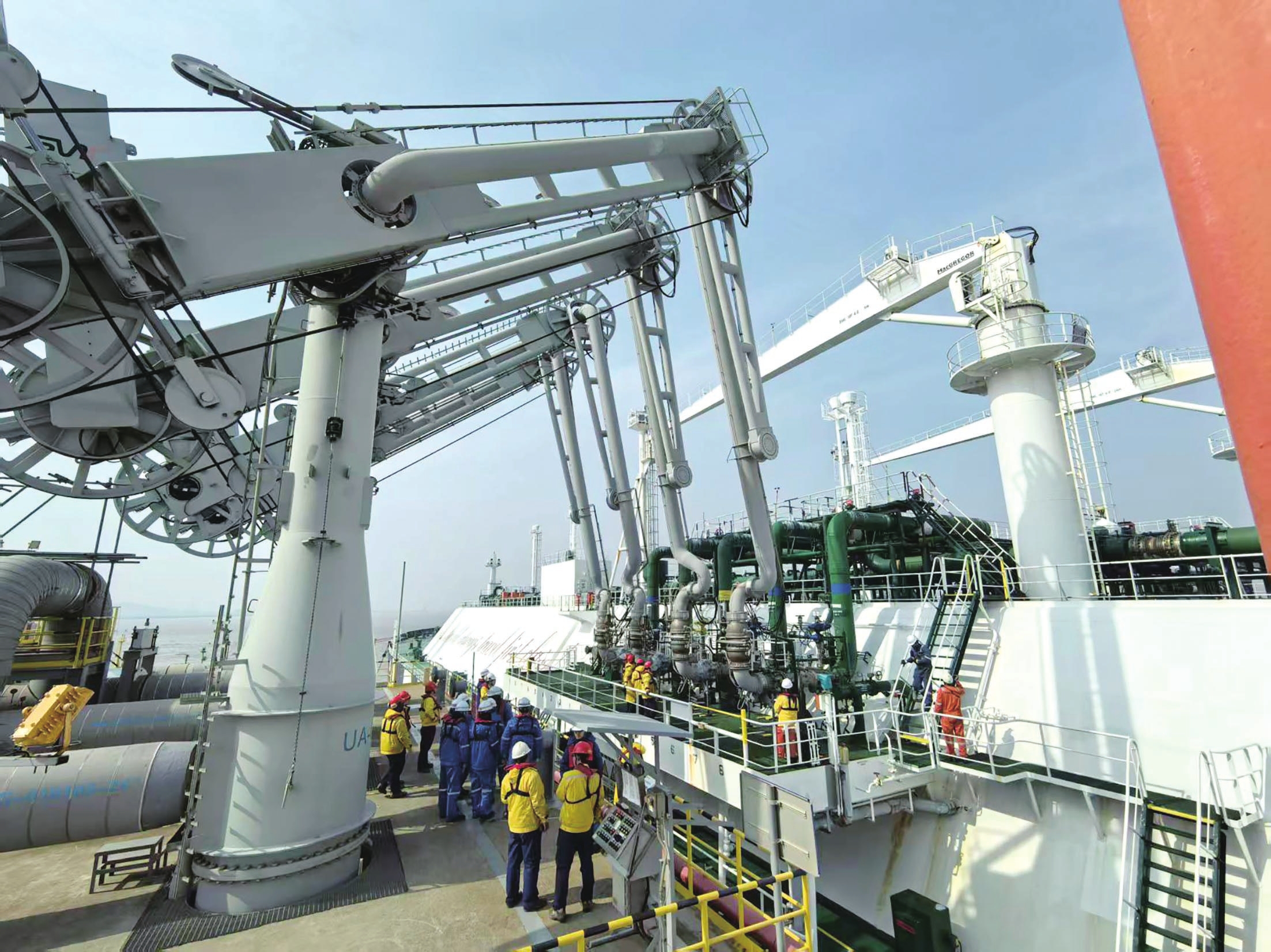 引航、靠泊、系缆绳、放置登船梯……与该码头之前的作业流程不同,为保障“青龙轮”高效通关,港航、海关、边检等口岸单位与企业密切沟通,精心制定保障方案,创新实施手续办理、联合查验与岸方作业“三同时”:船舶系缆完成后,边检民警登轮开展船舶合规性、人员资质及应急处置能力检查;与此同时,码头工作人员在完成相关证书核验后,同步进行卸料臂连接准备工作。