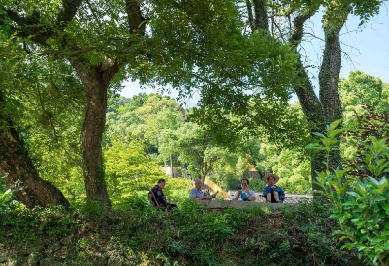 “老家哪里?来此做啥?”见有生人,他们热情地邀我来坐。等我报出祖上也是山里人家,拘谨的空气瞬间融化。咬烟老人自我介绍,他姓张,曾做过里山的会计,八十多岁了,耳虽有些背,身子骨却硬朗。说起里山的历史,记性好得出奇。“我们张姓来得不算最早,最早搬进这山坳里的,是苳、潘、吴三姓。算起来,这村子也有两百多年的历史啰。”说话间,山风从高高的树顶上溜下来,树叶与藤蔓一齐簌簌摇动,拂过他瘦长的脸,发出潮水般的低语。他又和我谈起接待寺的香火,谈起早已没了踪影的里山小学。那两株树,躲在身后,也成了忠实的听众,将这一切收纳进一圈圈的年轮里。