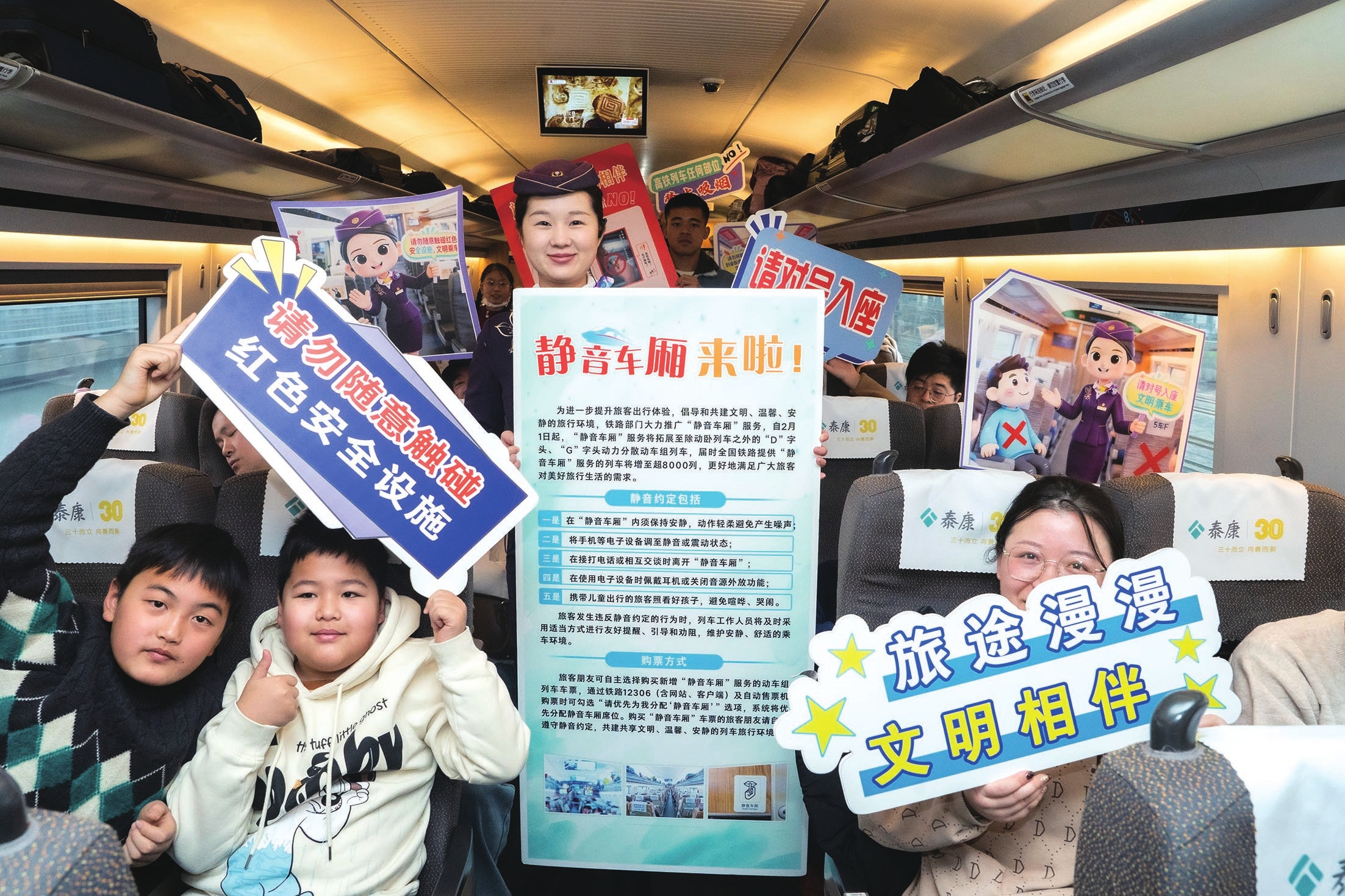 2月1日,中国铁路上海局集团有限公司合肥客运段在G54次列车上进行“静音车厢”宣介活动。