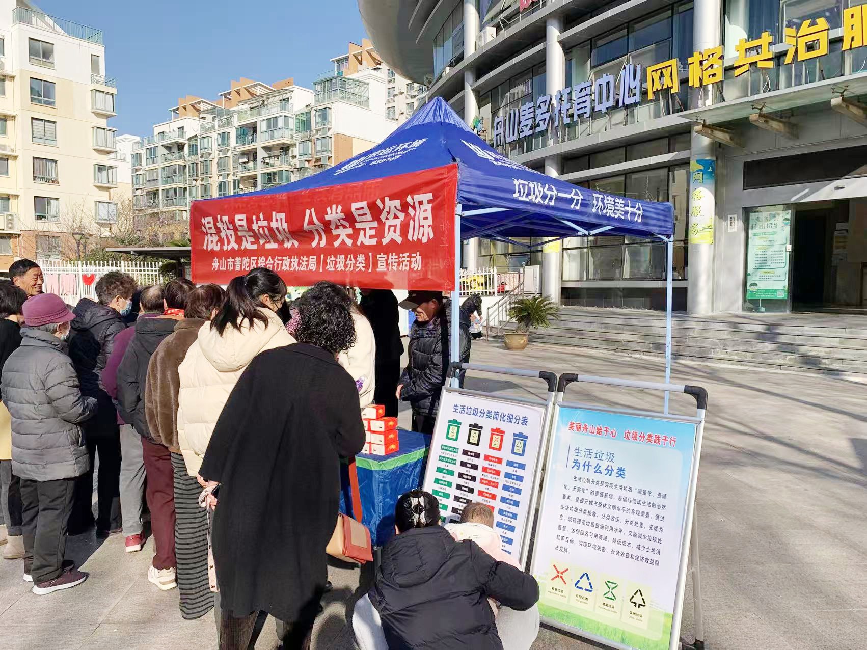 本报讯 近日,普陀区综合行政执法局联合联运公司在东港街道碧海莲缘小区开展“混投是垃圾,分类是资源”生活垃圾分类宣传活动。