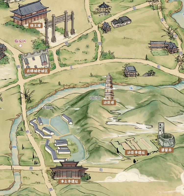 钱镠故居一带示意图。图中“衣锦山”即古石镜山;功臣寺遗址,即钱镠故居遗址。 王建富供图