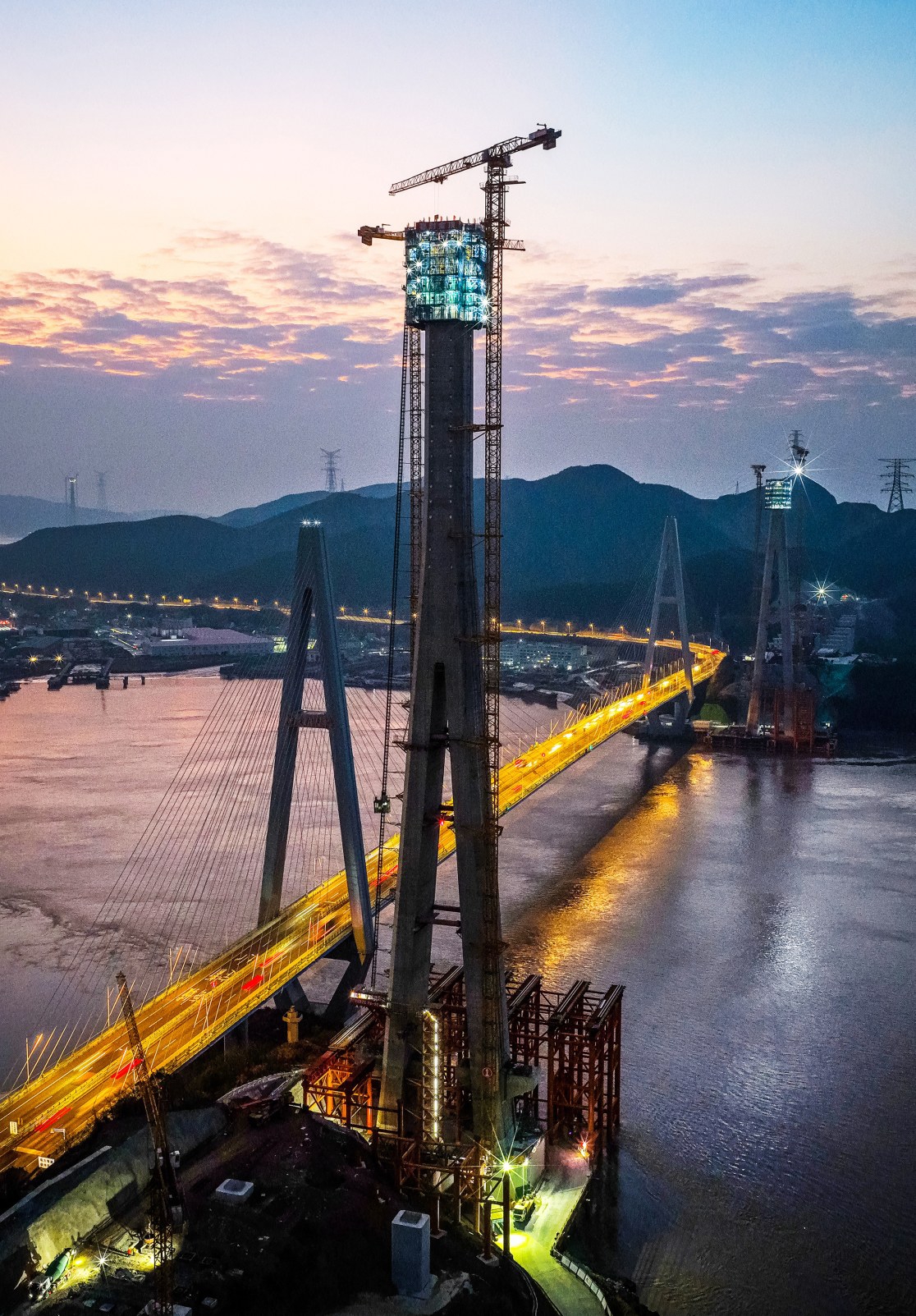 昨晚,甬舟铁路桃夭门公铁两用大桥首座主塔成功封顶,标志着大桥将进入斜拉索锚固与梁体架设阶段。本次封顶的富翅岛侧主塔高198.1米,采用空心钢筋混凝土结构。