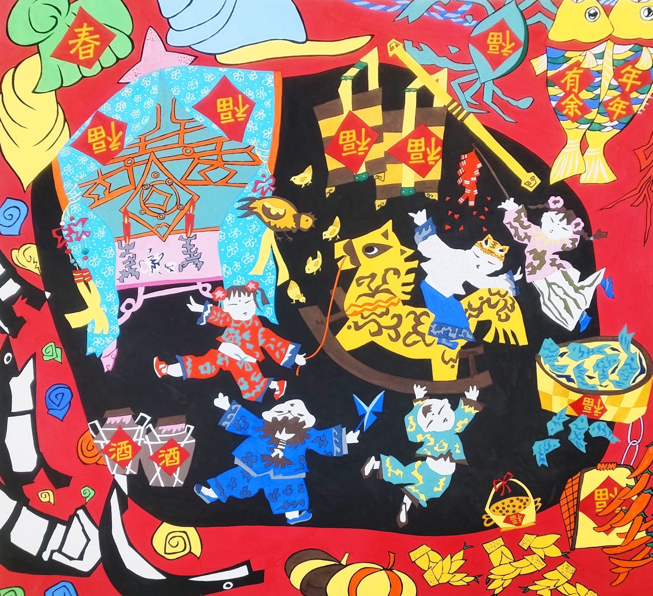 画面中,五个福娃嬉戏玩闹,金色的木马充满活力,周围点缀着望娘担、螃蟹、辣椒、竹笋、南瓜、渔船等元素,还有“年年有余”、“福”字等吉祥图案,整幅作品色彩鲜艳、构图饱满。