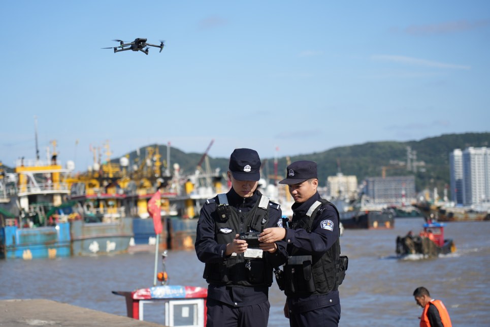 图为嵊泗公安民警在利用无人机进行生态巡查
