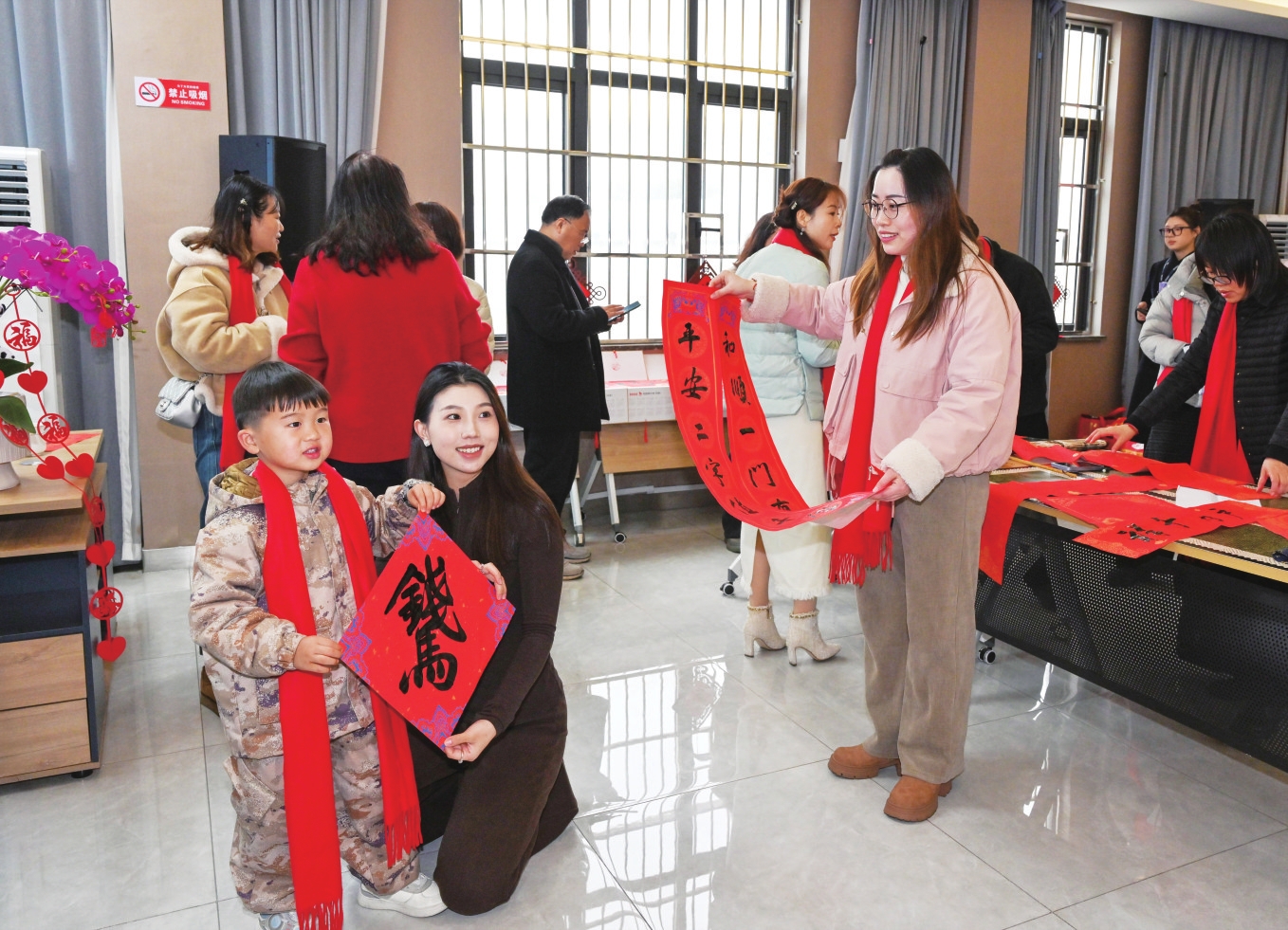 昨天,在市驻舟部队随军家属就业服务中心,来自市书法家协会的7位书法家挥毫泼墨,开展“万福迎春送万福进万家”公益活动。军嫂军娃欢欢喜喜地接过春联和“福”字,把新春祝福与浓浓年味带回家。