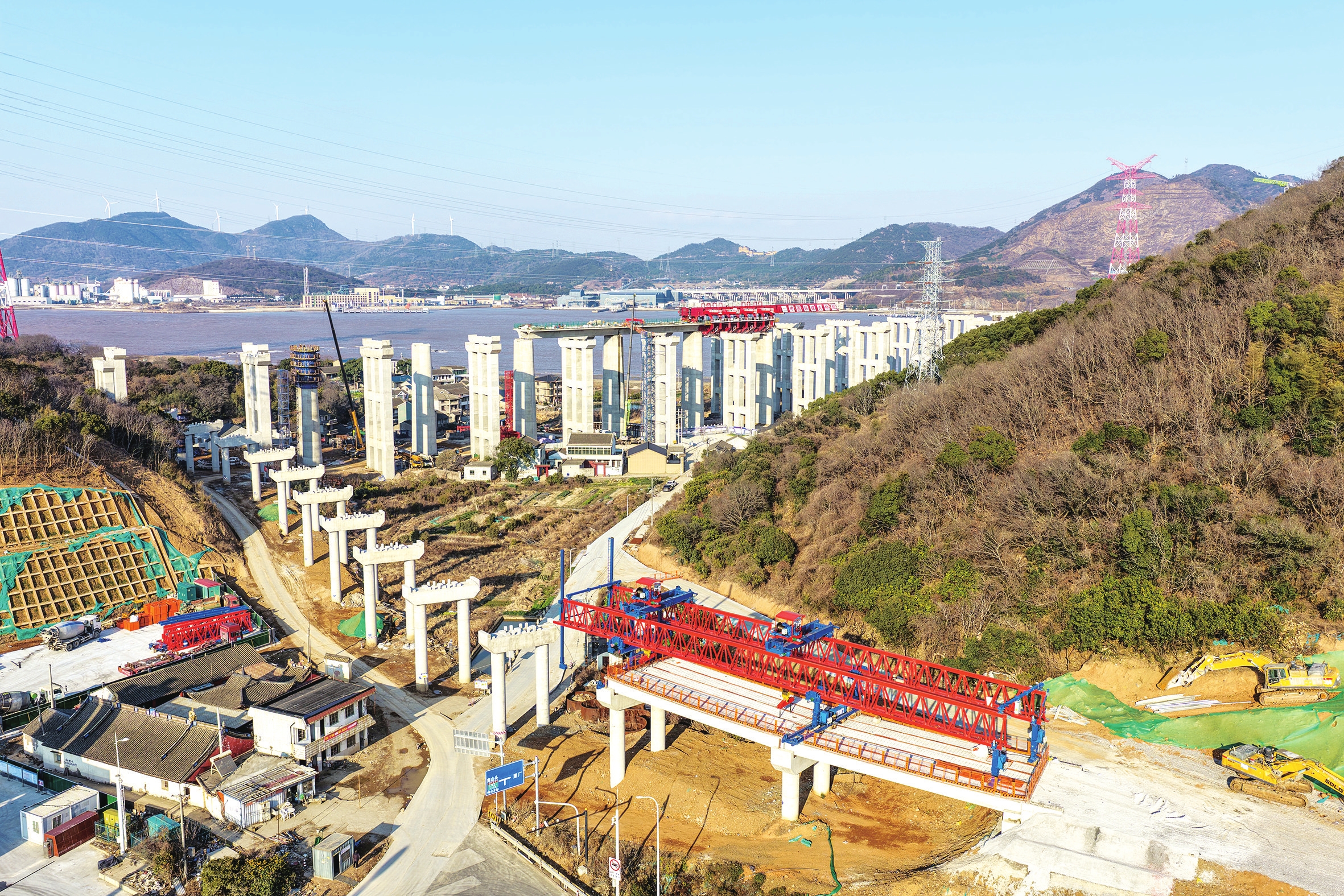昨天,正在建设中的甬舟高速复线富翅互通进入架梁施工。