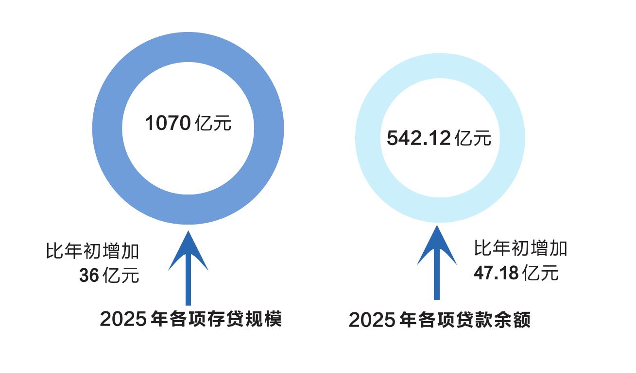截至2025年12月末,农行舟山分行存贷规模达1070亿元,比年初增加36亿元。实现存贷时点总量,存款时点总量、存款日均总量、日均增量,对公存款时点总量、对公存款日均总量,个人存款时点增量、日均增量,各项贷款增量,实体贷款增量,个人贷款增量等等多项指标四行第一。各项贷款余额542.12亿元,比年初增加47.18亿元,市场份额29.17%,比年初上升0.97个百分点。全年新增贷款主要投向绿色制造、专精特新、普惠小微、个人消费领域。