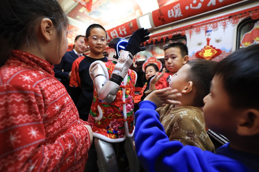 2月13日,小朋友在T48次列车“春晚”现场与仿生机器人互动。2月13日,在黑龙江齐齐哈尔开往北京的T48次列车上,哈尔滨铁路部门连续二十年举办的列车“春晚”如约而至。在多样的节目中,两个仿生机器人成为全场焦点,旅客沉浸在列车“春晚”温馨氛围的同时,也感受到了年味中满满的科技感。