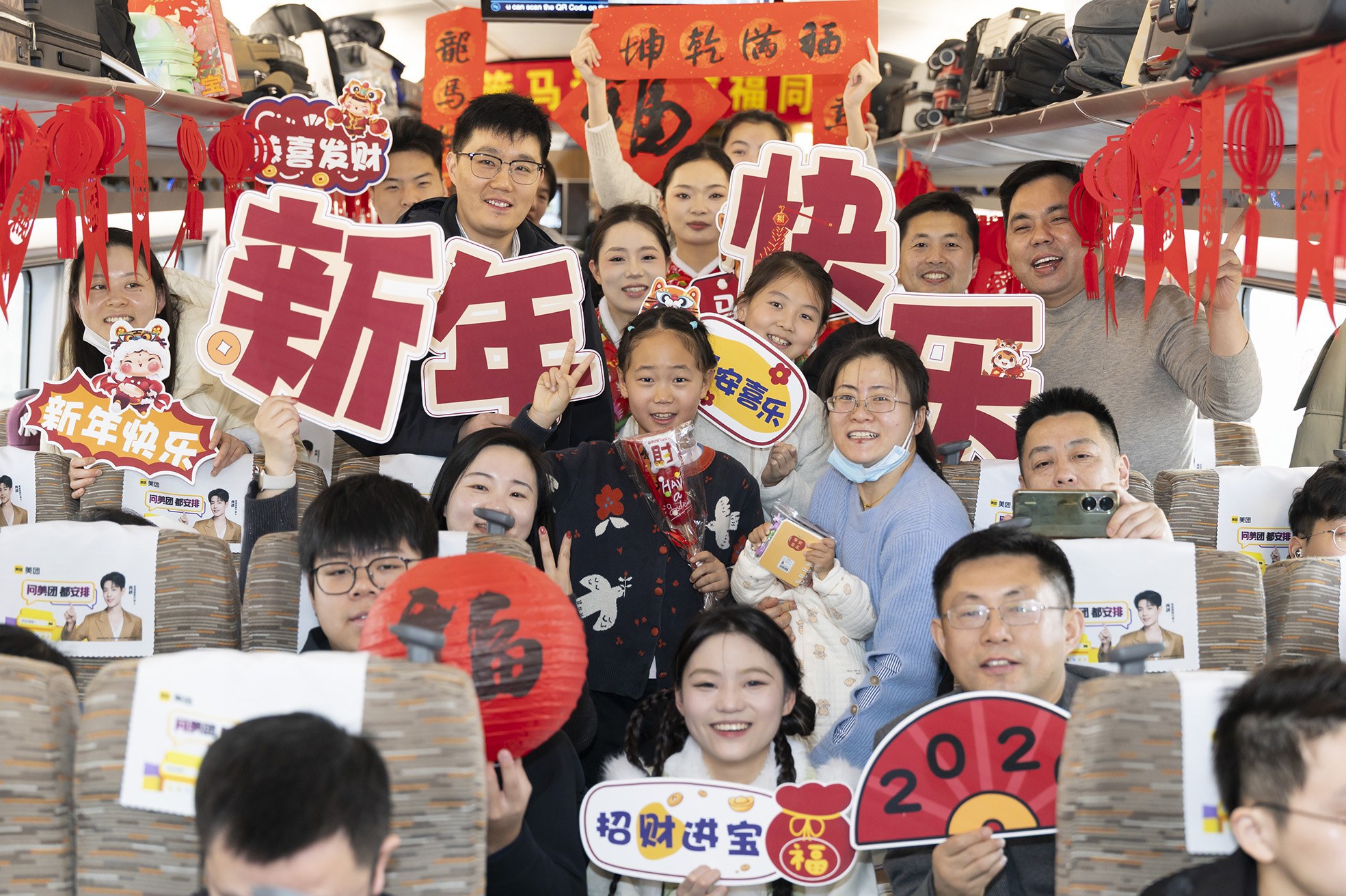 2月15日,旅客和乘务员在G452次列车上合影。