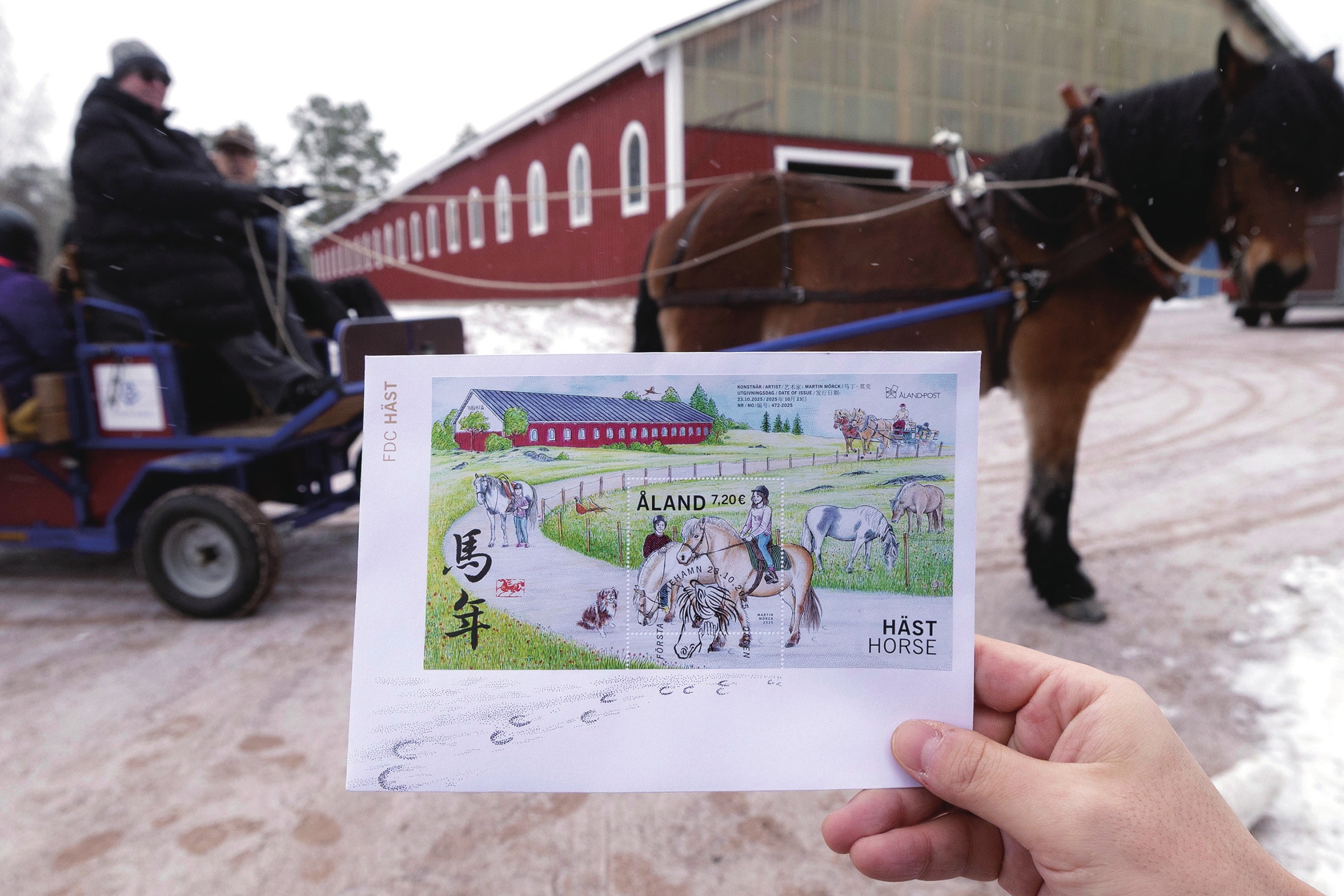 这是1月21日在芬兰奥兰群岛自治区首府玛丽港市附近一处马场拍摄的马年生肖主题邮票 新华社 发(马蒂·马蒂凯宁 摄)