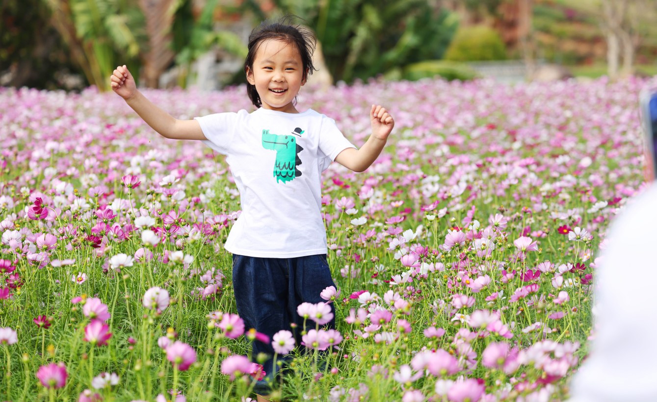 2月22日,一名小朋友在海南三亚南山文化旅游区花海中玩耍拍照。春节假期进入尾声,人们体验非遗、赏景休闲,享受多彩假日。