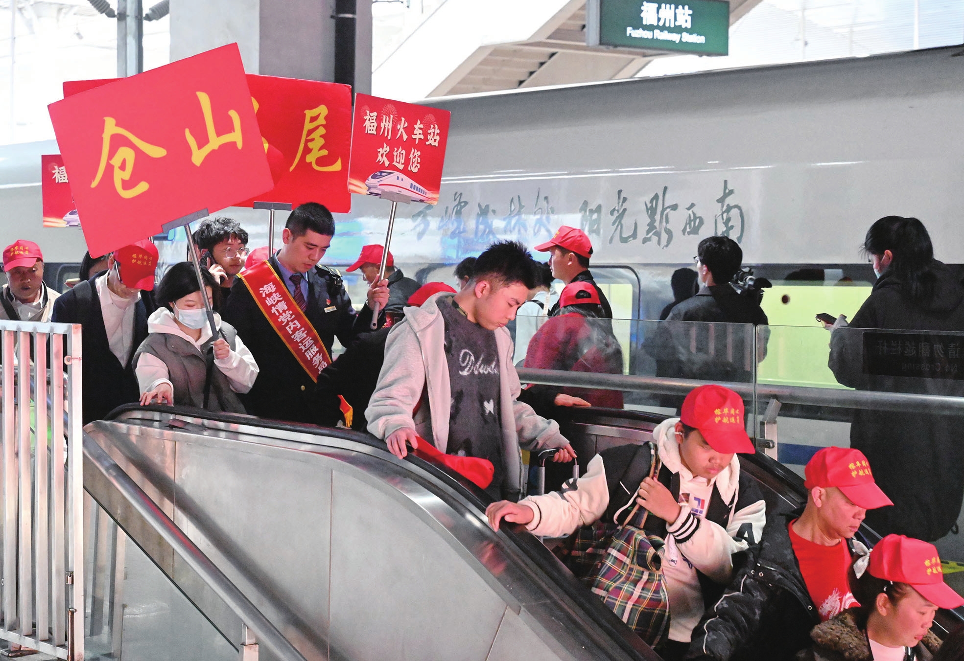 2月24日,务工人员在福州火车站。2月24日,来自贵州省的400名务工人员乘坐G2414次贵阳北—福州免费高铁返岗复工专列顺利抵达福州火车站。此次开行的“点对点”务工人员返岗专列,是福州市2026年“春风行动·就业援助季”重点举措之一,旨在全力保障企业节后复工复产,畅通务工人员返岗通道。